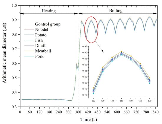 Figure 6 shows the variation of particle arithmetic mean diameter during boiling. There was no significant difference in the arithmetic mean diameter between different foods, but the arithmetic mean diameter of particles showed apparent regularity over time. At the initial stage of water heating, the arithmetic mean diameter of the particles was stable at around 0.35 µm. The arithmetic mean diameter of the particles decreased slightly as heating continued, reaching the minimum value at 320 s, which was 0.34129 µm (pork) < 0.3423 µm (doufu) < 0.3424 µm (noodle) < 0.3426 µm (fish) < 0.3429 µm (control group) < 0.3431 µm (potato) < 0.3440 µm (Meatball). After that, the arithmetic mean diameter of the particles increased sharply as the water reached boiling. The first peak occurred at 380 s, which was 0.8857 µm (pork) < 0.8886 µm (fish) < 0.8887 µm (doufu) < 0.8888 µm (noodle) < 0.8896 µm (control group) < 0.8923 µm (potato) < 0.8971 µm (meatball), respectively. At 360 s, there was a fluctuation due to the addition of food. During the boiling process, the arithmetic mean diameter of particles also fluctuated with time, and the fluctuation period was also 60 s. The amplitude decayed with time, and the arithmetic mean diameter showed an increasing trend.