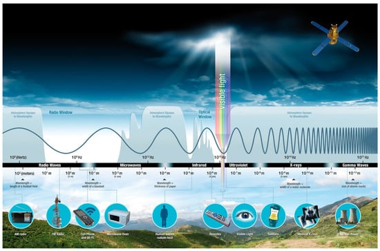 Remote sensing is the process of detecting and monitoring the physical characteristics of an area by measuring its reflected and emitted radiation at a distance [1,2,3,4,5]. Electromagnetic (EM) energy, produced by the vibration of charged particles, travels as waves through the atmosphere and the vacuum of space [6,7,8]. These waves have different wavelengths (the distance from wave crest to wave crest) and frequencies; a shorter wavelength means a higher frequency. Some waves, such as radio, micro-, and infrared waves, have longer wavelengths, while others, such as ultraviolet rays, X-rays, and gamma rays, have much shorter wavelengths. Visible light is in the middle of that range of long- to short-wave radiation. This small portion of energy is all that the human eye is capable of detecting. Instrumentation is needed to detect all other forms of electromagnetic energy (see Figure 1 taken from [2]).