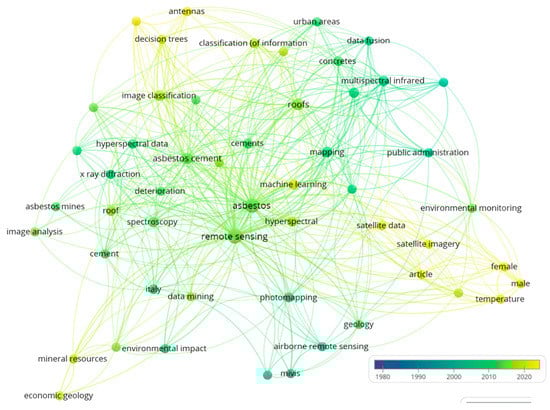 The words Remote sensing and Asbestos were searched for in Scopus, resulting in 708 works; then, through the free platform VOSviewer, the network of related keywords and their distribution per year were obtained (Figure 2). It is clear that in general, the issue of the remote sensing of asbestos–cement has had its greatest relevance in the last 20 years, due to strict regulation, especially in European countries [62], which has led to a greater sensitivity in the authorities and the academic world on the subject. The use of the words airborne remote sensing, MIVIS, multispectral infrared marked the 2000s [54], especially in studies in Italy, which also appeared as a keyword; however, in the last 5 years, the most trending keywords have been hyperspectral, machine learning, satellite data, and satellite imagery, showing an evolution in technology towards more precise sensors with higher bands both in aircrafts and at a satellite level [56,63]. The need to have greater spatial resolution and the costs of these images are the two contrasting factors that dominate the academic and professional scene. The dominant countries in these investigations are the United States, Italy, and China; however, adding the studies of European countries, it is noted that this continent represents the true center of research on asbestos and remote sensing worldwide. Asia also plays an important role as China, India, and Malaysia are dominant countries in these investigations, while Latin America has a deep lack of studies.
