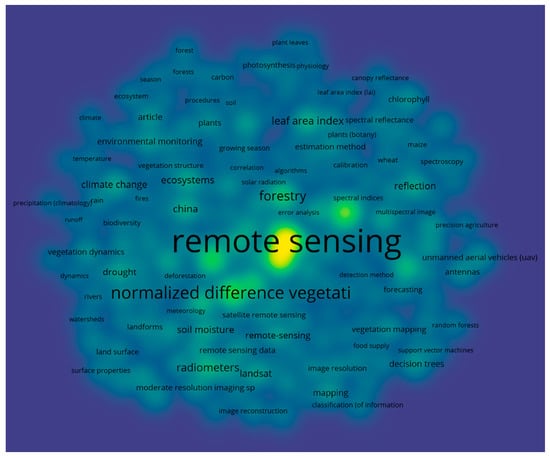 Scopus showed that there were 43,651 works that included the words Remote sensing and Vegetation in the keywords, abstract, or title. Figure 3 shows the most common results of the associated keywords. In terms of work frequency, the subject has had its greatest relevance in the last 20 years, probably due to greater attention to climate–environmental issues by institutions and companies. China, the United States, and Europe are the areas where the subject is most studied. Asia also plays an important role as China, India, and Japan are the dominant countries in these investigations, while Latin America again showed a trend that was similar to the case of asbestos.