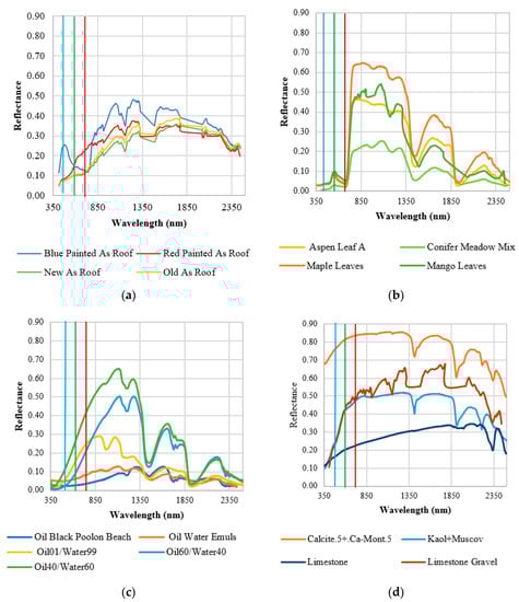 Spectral signatures of some materials within the categories: (a) asbestos, (b) oil and gas, (c) vegetation, and (d) soil. Vertical lines represent blue, green and red area of the spectrum. Reflectance can vary from 0 to 1.