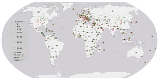 Summary of publications by country on oil and gas (black), asbestos (red), geology (brown), and vegetations (green).
