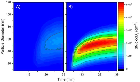 Evolution of OA particle size distributions for dark ozonolysis of 6-ppbv α-pinene under (A) dry (<1%RH) and (B) humid (60%RH) conditions. ξO3 = 500 ppbv.