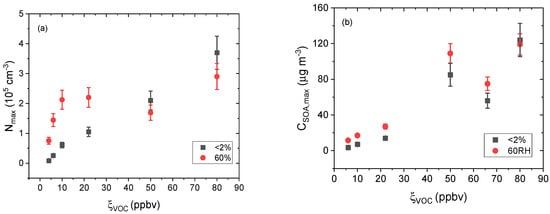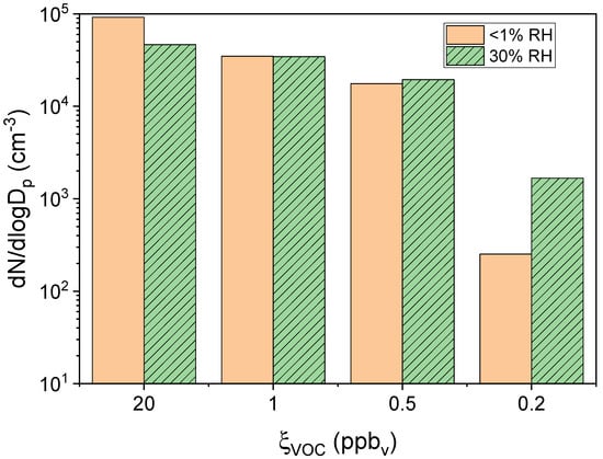 Studies typically indicate a negative correlation between RH and NPF. However, closer inspection of NPF and SOA formation data at the lower range of ξVOC studied suggests that this may not be the case. For example, Emanuelsson et al. [11] reported NPF for ozonolysis of β-pinene as a function of RH for three VOC mixing ratios: 79, 109, and 164 ppbv. In all cases, a decrease in NPF was measured (Figure 5a, extrapolated from data reported [11]). Considering only RH < 30% (below which there appears to be an inverse linear relationship between Nmax and RH), the slope from the linear regression for each data set can be plotted as a function of ξVOC to yield a linear curve with a y-intercept of 0.56 (Figure 5b). This suggests that, at low ξVOC, there could exist a positive correlation between Nmax and RH. We therefore conducted analogous experiments in the UVMEC with β-pinene at two RHs: <1% and 30%. The results are presented in Figure 6. As predicted from the data of Emanuelsson et al. [11], we see a reduction in NPF between the dry and humid trials at elevated ξVOC that inverts at about ξVOC = 0.5 ppbv. At ξVOC = 0.2 ppbv, while the absolute numbers of particles under dry and humid conditions decrease, as one would expect for the lower mixing ratio, we see a significant enhancement in NPF for the humid trial as compared to the dry trial. Note that the ξVOC used in this work cannot be compared directly to that of Emanuelsson et al. [11], as their experiments were conducted in a flow tube reactor, which requires much higher reactant mixing ratios due to the short reaction times.
