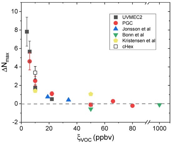 has a minimum value of −1 for complete elimination of NPF by RH, but no upper bound. Interestingly, we see that at low ξVOC, high RH results in increased NPF (Figure 3) in a non-linear fashion. However, at higher ξVOC of about 50 ppbv, the trend inverts, with high RH suppressing NPF, in accord with previous results [21]. Figure 3 highlights the absolute magnitude of the NPF enhancement, placing it in relation to the NPF observed for those same mixing ratios under dry conditions. Furthermore, it permits comparisons with the existing literature. For the latter cases, number data were obtained directly from tables in the previous reports or interpolated from graphical data. Using the absolute maximum particle number densities from the other reports in conjunction with Equation (1) allows us to estimate their NPF enhancement as a function of RH even though their O3 mixing ratios were somewhat lower than used in the present study, and different environmental chambers/flow reactors were used.