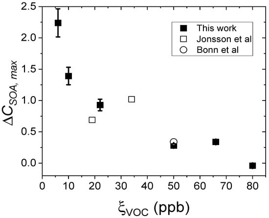 Change in dry SOA mass formed by ozonolysis of α-pinene at different ξVOC. ΔN = −1 for the case of complete shutdown of SOA formation and ΔN = 0 for no change. Error bars indicate one standard deviation for n = 4. The literature values are inferred from Jonsson et al. [12,25] and Bonn et al. [21].