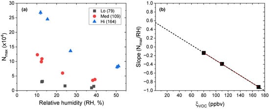 (a) Trends in NPF for β-pinene ozonolysis as a function of relative humidity. (b) Slope humidity trends in (a) as a function of ξVOC. Here, Nmax data (a) were extrapolated from Emanuelsson et al. [11], and the slope at each ξVOC (b) was determined by linear fits to the Emanuelsson data from 10 to 30% RH.