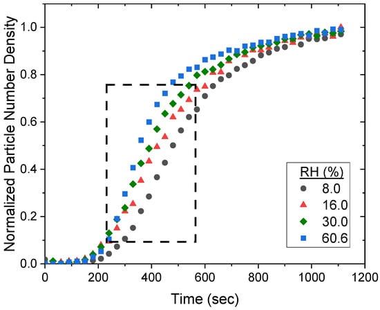 Normalized particle growth curves for ozonolysis of α-pinene at four RHs. The dashed box highlights the linear portion of each curve, where the normalized rate of formation (slope) was extracted for quantitative comparison.