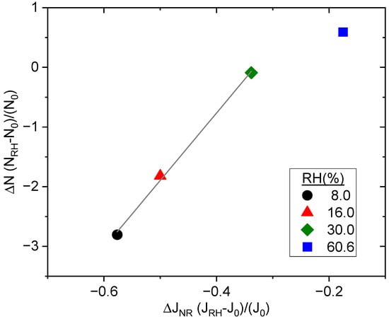 For the ozonolysis of α-pinene (ξVOC = 10 ppbv) under increasing RH, there is consequently an increase in the normalized rate of NPF (JNR). Table 4 outlines the rate results with respect to RH. At a ξVOC of 10 ppbv, there is a 31.9% increase in JNR at 60% RH compared to JNR at 8% RH. Therefore, the presence of water yields an effect on the rate of particle formation at particle genesis of SOA formed from atmospherically relevant ξVOC. To probe this idea further, we also observed that NPF enhancements (ΔNmax calculated in accord with Equation (1) for the different RH conditions studied) correlated with increased JNR at elevated RH (Figure 8). When performing a log-log plot of the enhancement of NPF under humid conditions with respect to JNR, the rate (slope) is 11.2, suggesting a very small increase in JNR results in a dramatic enhancement in NPF.