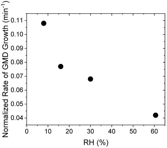 New particle formation will continue to dominate until CSOA ≳ C*(T). At this point, Cg will be effectively depleted and NPF disfavored relative to SOA growth. At higher ξVOC, CSOA rapidly reaches levels approaching C*(T) of anticipated products [36] of α-pinene oxidation, effectively maintaining Cg below levels of supersaturation and preventing homogeneous nucleation to form new particles. Furthermore, at the higher ξVOC, products are more volatile and therefore less likely to participate in NPF. The above hypothesis would predict that particle size growth rates would be greater at higher ξVOC, where partitioning is favored. On the contrary, at low ξVOC, where Cg is quickly depleted upon NPF and CSOA < C*(T), we would predict much slower particle growth (due to decreased partitioning). Figure 9 shows the normalized rate of change in GMD as a function of RH in the first 5 min of aerosol formation. We see that the particle size increases almost three times faster at 8% RH than at 60% RH. Keeping in mind that ξVOC and ξO3 were the same for all experiments, then clearly the enhanced growth rate at 8% cannot be due to enhanced partitioning due to water uptake in the particles. Therefore, it is likely that the greater rate of NPF at higher RH depletes gas phase concentrations before a significant CSOA is developed, thereby limiting partitioning and subsequent particle growth.