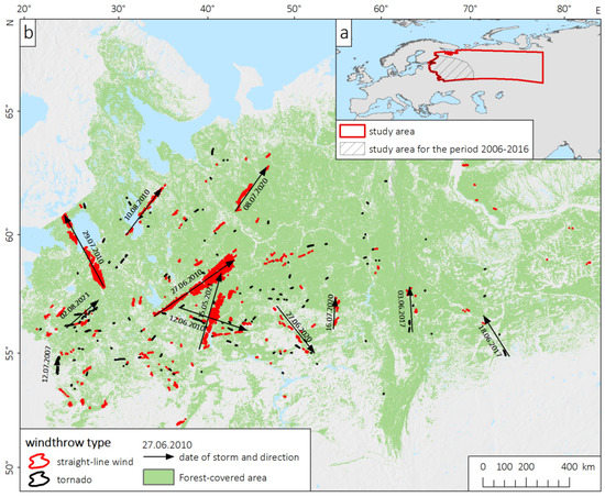 - Shikhov, A.N.; Chernokulsky, A.V.; Azhigov, I.O.; Semakina, A.V. A satellite-derived database for stand-replacing windthrow events in boreal forests of European Russia in 1986–2017. Earth Syst. Sci. Data 2020, 12, 3489–3513. [Google Scholar] [CrossRef]