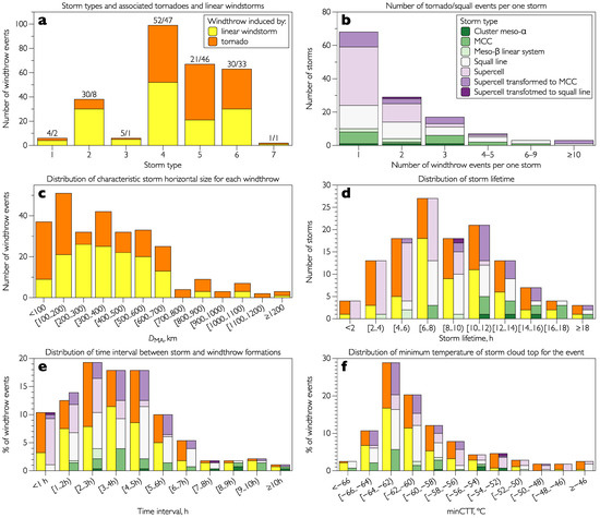 - Kalinin, N.A.; Shikhov, A.N.; Chernokulsky, A.V.; Kostarev, S.V.; Bykov, A.V. Environments of Formation of Severe Squalls and Tornadoes Causing Large-scale Windthrows in the Forest Zone of European Russia and the Ural. Russ. Meteorol. Hydrol. 2021, 46, 83–93. [Google Scholar] [CrossRef]