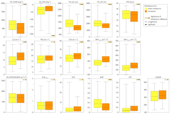 3.2.1. Differences in Convective Environmental Variables Associated with Linear Windstorms and Tornadoes