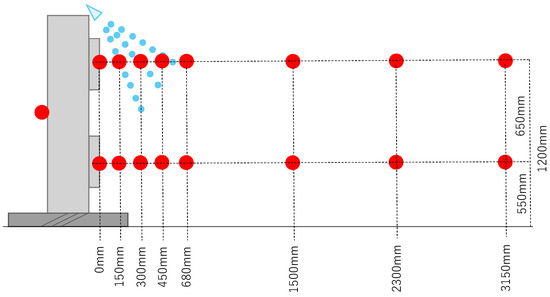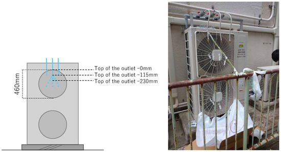 Figure 1 shows the measurement points of thermo-hygrometers around the condenser unit. Pedestrians were supposed to walk at 1500 m, 2300 m, and 3150 m from the condenser unit. The positions of the measuring points were set according to local conditions, but other similar situations could be expected. In terms of meteorological conditions, wind velocity, wind direction, air temperature, and relative humidity were measured on the upwind side of the condenser unit location. Figure 2 shows location of water spray and state of measurement around the condenser unit. Tap water was supplied to the water droplets by a branch from the tap water pipe. It branches into three outlets. The diameter of the air conditioning condenser outlet is 460 mm. The water droplet outlets were set for three conditions: at the top of the condenser outlet (0 mm), in the center (−230 mm), and in the middle of them (−115 mm). The water droplet volume was measured directly by placing a plastic bottle at the water droplet outlet for a certain period of time. The total water volume was 1.81 mL/s, but there was a slight variation of 0.50, 0.83, and 0.48 mL/s at the three outlets. The amount of water that reached the ground surface measured by installing a water container in front of the condenser unit was 0.15 mL/s. A part of the water droplets reached the ground surface without evaporating. The system operated continuously during the day when the air-conditioning units were in operation. Detailed measurements were carried out on representative days, during which the instrument was permitted to get wet. Shields were not provided to prevent the sensors from getting wet, so that the diffusion conditions of the water droplets were not affected.