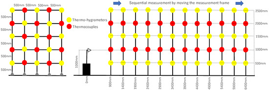 Measurement frame with thermo-hygrometers and thermocouples and overview of sequential measurement by moving the measurement frame.