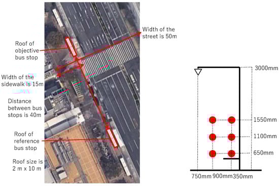 Figure 5 shows the location of objective and reference bus stops and measurement points of thermo-hygrometers. The top of the figure is north. The distance between the objective bus stop and the reference bus stop was almost 40 m. Figure 6 shows the mist sprays at a semi-open bus stop. Mist sprays were placed at 500 mm intervals facing downward. The mist spray design specification was 0.65 mL/s, 25 μm. The incident solar radiation and ventilation conditions at both bus stops were almost the same. It was assumed that a person who sits on a small bench to wait for a bus was exposed to air temperature and relative humidity at a height of 650 mm, while a person who stands to wait for a bus was exposed to air temperature and relative humidity at a height of 1100 mm.