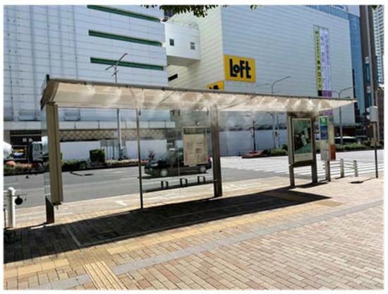 The chosen bus stop was located on the west sidewalk of the main street in the north–south direction in front of the terminal station. Because the sidewalk was wide (15 m) and the bus stop was located close to the roadway, it received solar radiation for a long time. However, ventilation was relatively better because the street was wide (50 m). The top of the bus stop had a roof of 2 m × 10 m in size with a height of 3 m, mainly to protect it from rain, but it also served to shield it from solar radiation. The shade by the bus stop roof moved depending on the time of day, so it was not always shaded inside the bus stop. The sides of the bus stop were partially enclosed by acrylic panels, which slightly blocked the air flow. Therefore, people waiting for the bus felt hot during the summer days. There are many similar bus stops in the city.