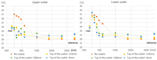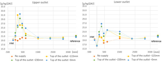 Figure 7 and Figure 8 show the measurement results of air temperature and humidity in front of air-conditioning condenser units from 10:17 to 12:03 on 25 August 2021. During this period, measurements were carried out by varying the water supply position. The location of water supply had little effect on air temperature and humidity. It is considered that the water droplets are diffused by the wind speed from the condenser unit outlet. The inlet temperature on the back side of the condenser unit is slightly higher than the reference temperature on the upwind side of the condenser unit location. It is assumed that the effects of short circuits caused by the condenser unit blowing out and the stagnation of air around the condenser unit. Water droplets lower the air temperature in front of the upper outlet to near the inlet temperature and the reference temperature. However, air temperature at the front of the lower outlet did not decrease, and it only decreased a little further away. The water droplets evaporated at the front of the upper outlet and at slightly distant points of the lower outlet due to the wind blowing from the condenser unit. Humidity increased by about 10 g/kg(DA) at the front of the upper outlet, while the increase at the front of the lower outlet was about half as much. The humidity sensor in front of the upper air outlet may have been wet and may contain measurement errors. However, the values illustrated in these figures were obtained stably during this measurement period and thus represent a generally stable pattern. Figures S1 and S2 show the measurement results of air temperature and humidity in front of air-conditioning condenser units from 14:27 to 15:22 on 25 August 2021.