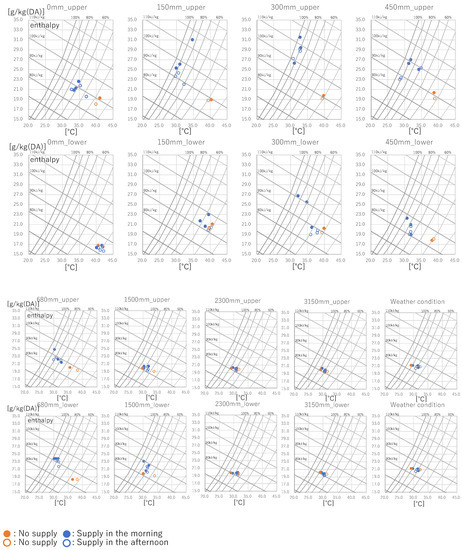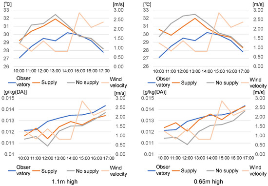 Figure 12 shows measurement results of air temperature, humidity, and wind velocity at semi-open bus stops on 21 September 2021. Figures S9–S12 show vertical section of measured air temperature and humidity at bus stops on 21 September 2021. This is a comparison of the results of hourly measurements taken at ‘Supply’ and ‘No supply’ bus stops. The meteorological observatory is located about 1.7 km east of the objective site. The wind velocity was measured at a height of 1 m at the objective site. The wind direction was south along the street direction throughout the day. By 13:00, both ‘Supply’ and ‘No supply’ air temperatures were higher than the meteorological observatory, and ‘Supply’ air temperature was slightly lower than ‘No supply’ air temperature. Air temperature in the semi-open bus stop tends to increase during the hours of sunlight, when ventilation is suppressed. After 15:00, the wind velocity increased and air temperature at the semi-open bus stop was almost the same as the meteorological observatory. The humidity at the bus stop was lower than the meteorological observatory all day, and ‘Supply’ humidity was slightly higher than ‘No supply’ humidity.