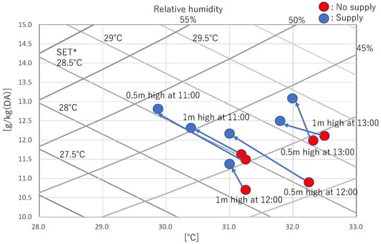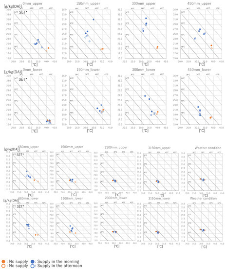 Figure 9 and Figure 10 shows air temperature and humidity changes by water droplets evaporation and iso-enthalpy and iso-SET* lines. The standard new effective temperature (SET*) was calculated assuming a typical summer shade condition; mean radiation temperature (MRT) is 30 °C, wind velocity is 1.0 m/s, clothing volume is 0.6 clo, and metabolic rate is 2 met, assuming one is walking. The background contours in Figure 10 were created based on SET* values calculated for gradually varying air temperature and humidity. Water droplets released into the air evaporate by taking away the latent heat from the air. As a result, the temperature of the air decreases, corresponding to the lost latent heat. Then, the lowered temperature is converted into a lowered sensible heat of the air and it corresponds to an increase in water vapor in the air (humidity). Therefore, there is an iso-enthalpy change from ‘No supply’ to ‘Supply’ in Figure 9. A decrease in the air temperature of 10 °C corresponds to an increase in humidity of 4 g/kg(DA). At this time, from Equations (3) and (4), dQs = dQl, which means that people should not feel hot or cool. The SET*, which is expressed in terms of air temperature that results in the same experience as that of 50% relative humidity, also changes along the iso-SET* line, as shown in Figure 10. It also varies along the iso-hyperthermal line, so the wet bulb globe temperature (WBGT), which is strongly affected by it, does not change either.