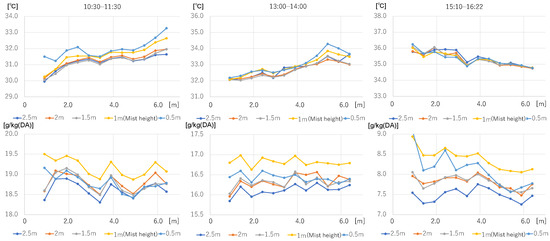 Figure 11 shows measurement results of air temperature and humidity in front of mist spraying in an open space in a park between 10:30–11:30, 13:00–14:00, and 15:10–16:22 on 27 August 2021. Figures S3–S8 show vertical section of measured air temperature and humidity in a park at 10:30, 13:00, and 15:10 on 27 August 2021. The horizontal distribution perpendicular to the spray axis was not confirmed significantly, so the values averaged for each height are shown. In each measurement period, the frame with the thermo-hygrometer and thermocouples was moved, so the data measured at fixed points were used for time correctness. The measurement data were corrected to the start time of each measurement period. Therefore, Figure 11 only shows the spatial distribution of air temperature and humidity with distance from the mist spray. Depending on the meteorological conditions of the day, the air temperature was low in the morning and continuously increased in the afternoon and evening. Conversely, humidity was high in the morning and continuously decreased in the afternoon and evening. At all times, the humidity at the height of the mist spray, 1 m high, was the highest, followed by 0.5 m high, and the humidity at the upper part was slightly lower. The relationship between distance from the mist spray and humidity is not clearly confirmed. In the morning and afternoon, air temperature decrease is observed within 2 m of the mist spray but not in the evening. In the morning and afternoon, heating from the ground surface receiving solar radiation was observed, especially at a distance of more than 5 m from the mist spray. In the evening, the entire area was heated and hot. The effects of mist spraying on an open space receiving solar radiation are limited to within 2 m of the mist spray, under the influence of heating from the ground surface. Air temperature decrease of about 0.5 to 1 °C due to mist spray on an open space is limited to within 2 m of the mist spray, due to the effect of heating from the ground surface receiving solar radiation. In contrast, an increase in humidity of about 0.5 to 1 g/kg(DA) at the height of the mist spray is not spatially limited. In this case, the ratio of the decrease in air temperature to the increase in humidity is dt/dx = (0.5~1.0) < 2.5 [K/(g/kg(DA))], so people should not feel cool.