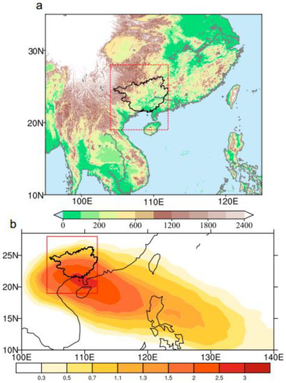 - Qin, W.; Zhou, M.; Xu, S. Causality analysis of more tropical cyclones affecting Guangxi in 2013. Meteorol. Mon. 2015, 42, 709–715. (In Chinese) [Google Scholar]