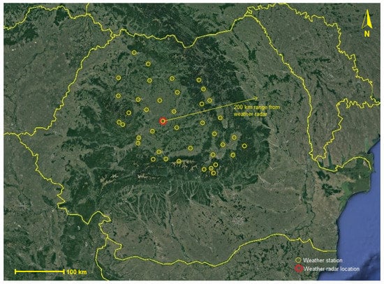 Heavy rainfall may lead to flash floods, overflowing rivers or landslides, representing a frequent and widespread severe weather hazard for population safety and the economy, with flash floods alone causing more than 5000 fatalities annually, according to the World Meteorological Organisation. Quantitative precipitation estimation (QPE) [] is one of the most important and challenging tasks in meteorology [], as it represents the primary method for approximating the rainfall over locations where direct field observations are not available, thus providing meteorologists and hydrologists valuable information for early warnings issuing. In spite of the great scientific and technological developments made over the past decades, higher spatial and temporal accuracy of precipitation forecasts [] is demanded by both meteorologists and the public at large.