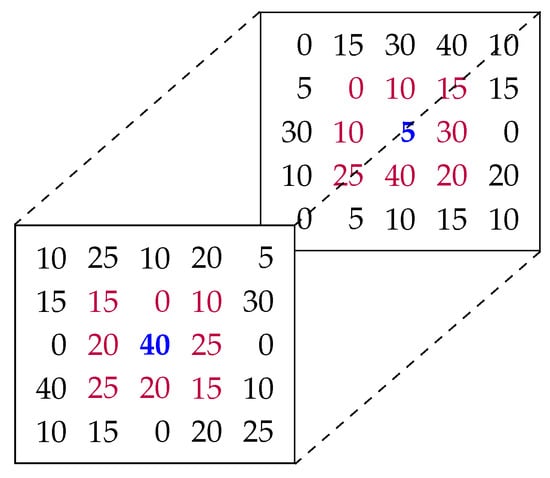 As an example, let us consider the 5 × 5 dimensional data grid from Figure 2. The grid contains the values for (front) and (behind) for each cell on the data grid, at time step t. The location of the weather station is (i.e., and ) and the diameter d is also 3.