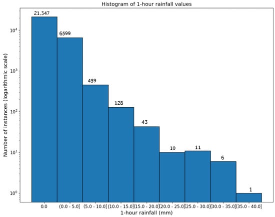 To better understand the rainfall data from , we present the histogram in Figure 3, which illustrates 1-h rainfall recorded at weather stations. The OX axis depicts rainfall in millimeters, while the OY axis shows the number of instances labeled with a certain rainfall rate, using a logarithmic scale. Thus, the histogram shows the number of instances () for which the ground truth () was in the interval represented by each bucket. The buckets count values in increments of 5 with the value 0 being counted separately—that is, the first bucket shows the number of instances for which the ground truth was 0, the second bucket shows the number of instances for which the ground truth was between 0 and 5 and so on. Note that the number of instances is on a logarithmic scale due to the large differences between the values in each bin. The instances with ground truth 0 were depicted in a separate bin in order to highlight the high number of such instances—more than three-fourths of the total number.