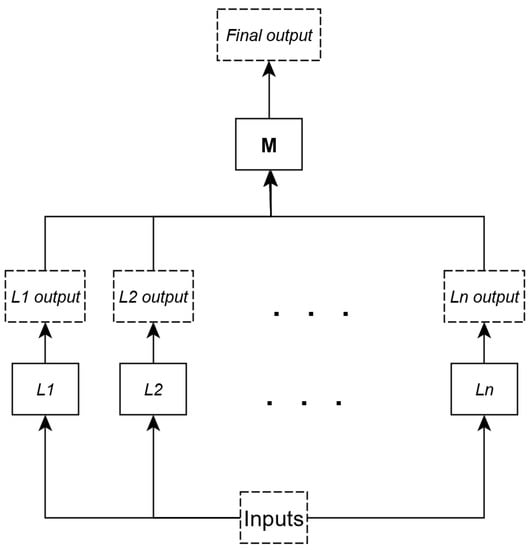 Stacking [] is a method used in the ensemble learning paradigm [] which uses multiple individual ML learners for obtaining a better predictive performance. Stacking involves training an ML algorithm (on the top of the stack) to combine the predictions of several individual ML learners (base predictors). The idea behind stacking is the following: the base algorithms are trained on an available training data set, then the algorithm on the top of the stack is trained on the outputs of the base learners (used as inputs) to make the final prediction. Thus, through stacking several heterogeneous learners are combined by training a meta-model M which takes as inputs the outputs of the base learners and will learn to return the final prediction from these inputs. Figure 4 illustrates a stacking ensemble learner.