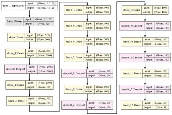 For our custom DNN model, we used the architecture presented in Figure 5. In order to increase the readability of the proposed architecture, we color-coded the different layers. The main ones are the Dense layers colored in yellow and the Dropout layers colored in red. There are 2 special layers, the Input layer which specifies the input of the neural network—an image section representing the neighborhood around a location, along with its previous time steps—and a Flatten layer which creates the instance vector described in Section 3.2. For the stacking model that has our neural network model on top, as explained in Section 4.2 (), the neural network architecture is the same with the exception of the input layer, which is adjusted to input the previous models’ prediction instead of an image section.