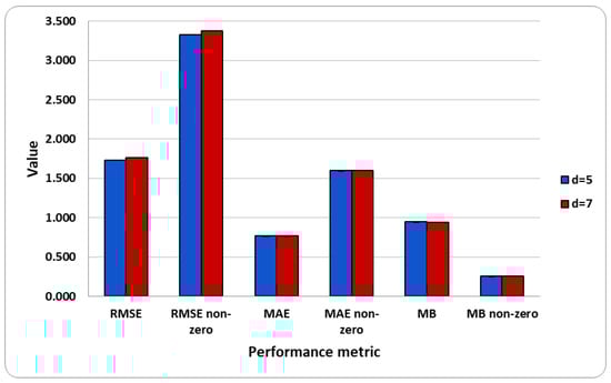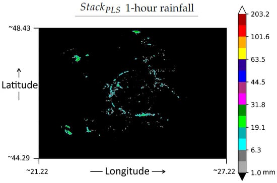 Since we gathered data from 40 ground weather stations over 30 days, contains 28,800 instances (for every hour we had 40 stations, there are 24 h in a day and 30 days of data). However, there were some missing data, due to the impossibility to gather data from some ground stations at some hours; therefore, is a medium-sized data containing 28,605 instances with non-missing values. We used of for training the ML models, and of for validating them. The remaining from the data set was further used for testing. More details about the training–validation–testing split is given in Section 4.4. The radar and rainfall data sets used for this paper can be found at [].
