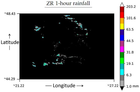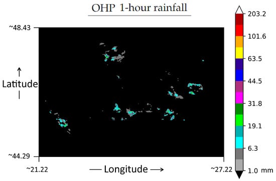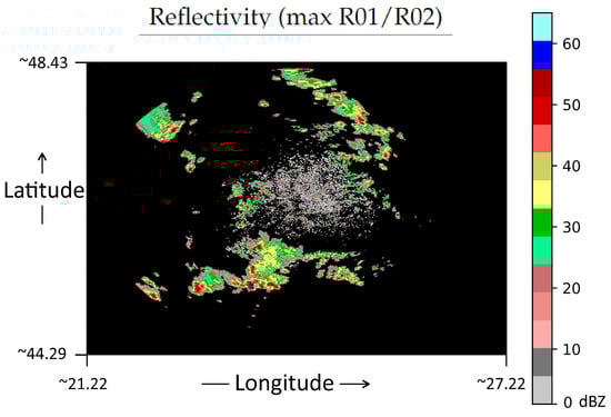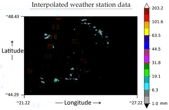 The maximum between the R01 and R02 values in 27 June 2016 between 18:03 and 18:59 are illustrated in Figure 10. Figure 11 presents the map depicting interpolated weather station data. The interpolation method used is currently in operational service at the Romanian Meteorological Administration, and it is a regression-kriging model that combines ground observations with weather radar precipitation estimates and local topography as ancillary data for generating sub-daily precipitation gridded data sets in high spatial resolution (1000 m × 1000 m) []. The weather radar data employed by the interpolation method comes from a national mosaic generated from the first two elevations angles, at 0.01 degree spatial resolution and 1-h temporal resolution.
