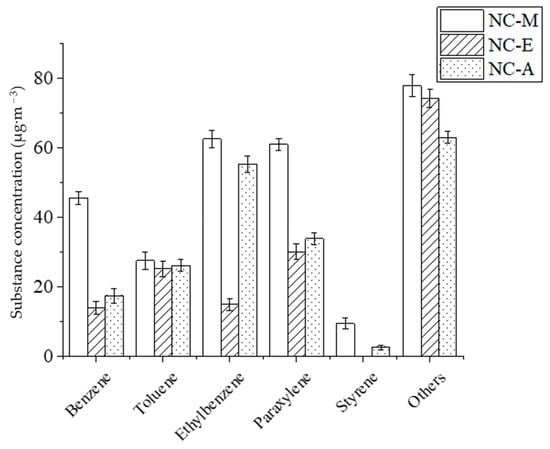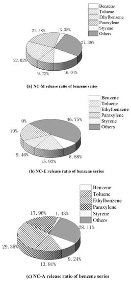 The compounds in Figure 2a–c include BTEX, styrene and other Benzene Series. Based on the proportion of each substance, the components affecting the indoor air quality could be intuitively judged. The composition and structure of the Benzene Series changed after coating the MDF with NC-M, NC-E, and NC-A. There were 12 common components of the Benzene Series released from the three kinds of MDF, and BTEX made the largest contribution. The Benzene Series released by NC-M included complex species. The concentration of BTEX was 196.98 μg·m−3, accounting for 69.25% of the total concentration of Benzene Series, indicating that the concentration of BTEX would continue to affect the indoor air quality for a period of time. The release of BTEX should be controlled first to improve the air quality. In NC-E and NC-A, the proportion of detected BTEX in the total concentration of BTEX decreased to 30.09% and 42.06%, respectively, which greatly reduced the effect on the air quality. The proportion of benzene decreased from 16.04% to less than 10%, the proportion of styrene in NC-E decreased to 0, and the proportion of styrene in NC-A decreased to 1.43%. When the content of BTEX reduced, other Benzene Series such as phenanthrene, fluorene, and biphenyl accounted for a relatively large proportion. These substances were not released as quickly, and they cause less harm to the human body. Thus, only BTEX had the decisive influence on the total concentration of Benzene Series.