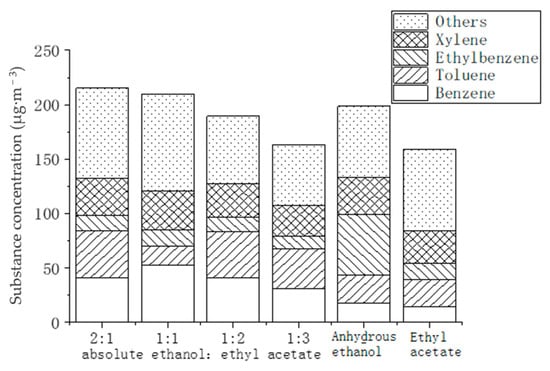 In this experiment, absolute ethyl alcohol and ethyl acetate were used to replace the mixed solvent in the original paint to coat the 18 mm MDF. The veneered MDF with the thickness of 18 mm was coated with NC paint which had been prepared with the three diluents mentioned in Section 2.1. The component and concentrations (μg·m−3) of all of the Benzene Series detected are shown in Table 2.