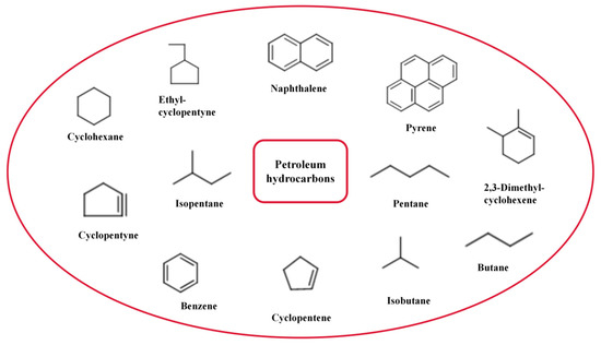 The structure of PHCs is composed of approximately 57% aliphatic hydrocarbons, approximately 29% aromatic hydrocarbons, and approximately 14% asphaltenes with different polar compounds. In addition, aliphatic hydrocarbons can exist in linear or branched hydrocarbons with unsaturated or saturated forms [11]. They are listed as one of the key monitored chemical pollutants by the United Nations Environment Programme (UNEP) [12]. PHCs mainly refer to a compound with two or more benzene rings connected in fused or non-fused rings (Figure 1), divided into short-chain hydrocarbon, diesel oil, kerosene, and gasoline [13,14]. PAHs are one of the main toxic components of crude oil [15,16]. They have bioaccumulation effects in many biological chains in nature, and their content in nature is quite astounding; hence, they are considered the main organic pollutants that are harmful to human health [17]. Table 1 compares the concentrations of PAHs in different regions. Low molecular weight PAHs, i.e., NAP, ACE, ACY, FLU, and PHE, were significantly higher in the Delhi region than in Sao Paulo and Houston. ACY and ANT are highest in Delhi (16.1 ng/m3), unlike Hong Kong, where PYR concentration is highest (6.35 ng/m3). In previous studies, PAHs concentrations in the Houston area were the lowest, except for NAP.