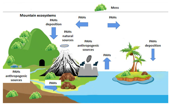 Currently, research mainly focuses on the PAHs in PHCs and less on other components. Ares [86] proposed a simple and economical method to identify small-scale pollution sources of PAHs. This method is used to test whether there is a decreasing gradient of PAHs concentration in mosses related to the distance between different emission sources. The concentration of PAHs was measured at 35 atmospheres of sampling points. Each atmosphere of sampling points was 1 km away. Ötvös [81] explored the source of PAHs in Hungarian moss samples and compared the PAHs concentration measured in moss samples with other forms of vegetation in the world in order to determine the accumulation mechanism of PAHs on mosses according to the octanol atmosphere partition coefficient of various PAHs. In the initial stage, mosses began to be used to monitor the deposition of atmospheric pollutants. Most of the research objects mainly focused on organic pollutants, such as organochlorine pesticides, pesticides, and polychlorinated biphenyls, and then gradually involved studying PAHs in PHCs. Currently, some studies have been carried out around the world using mosses as passive sampling materials of natural plants to monitor the pollution level of PAHs in the region and indicate the spatio-temporal variation of PAHs. Gerdol [83] collected 19 samples of mosses from industrial areas, residential areas, urban centers, and suburbs of Italy to analyze the content of 16 kinds of PAHs, indicating that the content of PAHs in urban areas was significantly higher than that in rural areas. In addition, the concentration of phenanthrene, fluoranthene, and pyrene was the most abundant and the highest in industrial areas, while the concentration of low molecular weight PAHs was the highest in rural areas. Galuszka [79] analyzed 16 PAHs and 33 inorganic elements in Hylocomium splendens and Pleurozium schreberi at 10 sampling sites of 2 forest types (dry pine forest and continental coniferous forest) in the mountains of southern Poland. The analysis showed that PAHs with different ring numbers were distributed differently in mosses. Four-ring hydrocarbons accounted for the largest proportion of all aromatic groups in the moss species examined. Three- and five-ring hydrocarbons show similar second-highest concentrations and were significantly superior to the six-ring equivalents.
