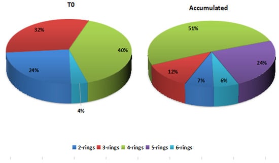 Grouped by ring number, as a percentage of total PAHs, in pre-exposure moss (T0) and accumulated in exposed moss pockets (created by author).