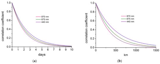 (a) Temporal and (b) spatial correlation coefficients at 440 (violet line), 675 (green), and 870 (red) nm.