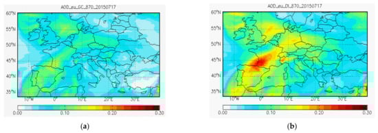 Using the STOI method, we estimated the distribution of the daily averaged AOD in Europe for 2015–2016. Figure 3 shows an example of the distribution of daily mean AOD at 870 nm before STOI (modeled by GEOS-Chem) and after STOI (estimated using assimilated AERONET observations) for 17 July 2015. We chose the date arbitrarily. The example illustrates the change in AOD distribution over Europe after applying STOI.