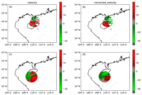 Doppler radar radial velocity of the first sweep at 0600UTC 13 October. (a) Raw data of HKRD; (b) unfolding data of HKRD; (c) raw data of SYRD; (d) unfolding data of SYRD.