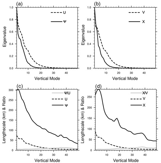 Eigenvalue rescaled by the first vertical mode ((a) ψ and U; (b) χ and V) and length scale with the ratio ((c) ψ, U and ψ/U; (d) χ, V and χ/V), with vertical mode.