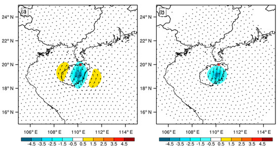 The increments of wind vector on 850 hPa at 0600 UTC 13 October. ((a) DA_ψχ; (b) DA_UV). (Shaded; units: m s−1). The center location of Kompasu from CMA is indicated (red asterisk).