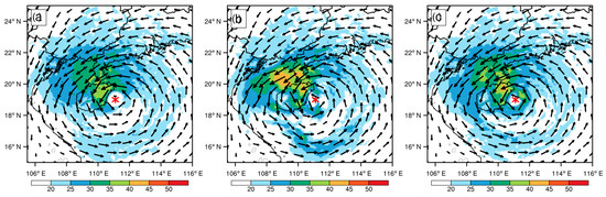Wind speed with units as m s−1 of (a) background and (b) DA_ψχ; (c) DA_UV) analysis and vector on 850 hPa at 0600 UTC 13 October. The center location of Kompasu from CMA is indicated (red asterisk).