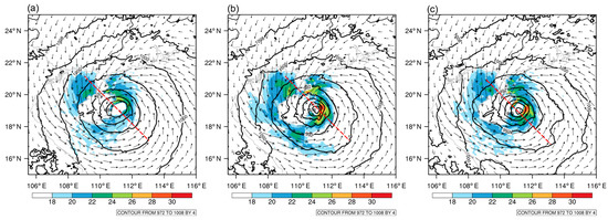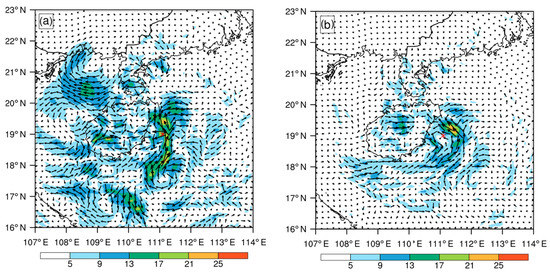 In the study, Haikou Radar (110.246° E, 19.996° N, altitude 118.0 m, type CINRAD/SA) and Sanya Radar (109.592° E, 18.228° N, altitude 443.0 m, type CINRAD/SC) were used. Before assimilation, non-meteorological radar returns were removed based on the MetSignal algorithm [17]. Isolated points were removed, and echo-filling was done. When a TC was detected by radar, the radial velocity of the radar tends to appear velocity ambiguity. Based on the python library Pyart [18] with the region-based algorithm, the Doppler velocity was unfolded. It is now a common practice to perform a second quality control prior to thinning data: any radial velocity with values larger than 70 m s−1 or smaller than 2 m s−1 were discounted. Other radial velocity data were discounted with distances to the radar smaller than 4 km height [19]. The main purpose of this approach was to minimize the effect of ground clutter. The Chinese Next Generation Weather Surveillance Radar 1998 Doppler removed the zero-frequency ground signal interference in the signal processing stage. The interference of bio-echoes were also removed in the phase of identifying meteorological echoes. Therefore, we removed only the data with radial wind speed larger than 70 m/s in the second quality control. Finally, a bilinear interpolation algorithm was used to reduce the radar data to match the WRF grid (5 km). It reduced the data correlation. The observation error of radar radial velocity was set at 2 m/s [20].