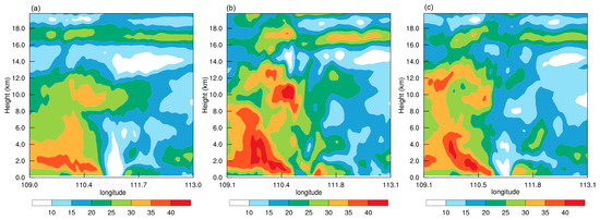 The cyclonic nature of the DA_UV wind field is more pronounced in terms of single-level surface elements, while the sea-level pressure field is similar in two DA experiments. To investigate the variation of the vertical structure of the TC, Figure 9 shows vertical cross sections of analyzed horizontal wind speed that are along the red lines in Figure 8. The extreme center of the wind in CTRL is around 2 km height, and the wind speed is less than 40 m/s. The wind speed decreases from 2 km height upwards, and the top of the TC is about 13 km height. The TC’s eye area boundary was obvious and wind speed was less than 10 m/s in the TC’s eye while it increased outwardly. DA_ψχ compared to CTRL, the wind field was significantly enhanced, with the maximum wind speed exceeding 40 m/s. However, the extreme center of DA_ψχ was not concentrated and the range was larger. A severe convection occurred at about a 10 km height and the wind speed in the area exceeded 40m/s. Because the severe convection was isolating and such a strong wind speed is not expected to occur at such a high altitude, it was judged as a false convection. At the same time, the TC center became blurred and there were no areas of wind speeds less than 10 m/s at the lower levels. The wind field in DA_UV was also enhanced relative to CTRL, with the area of strong winds changing from flat to upward rumbling. The structure of the TC’s eye area was obvious, with the vertical column’s wind speed less than 20 m/s extending to the top of the TC. DA_UV simulated the vertical structure of the TC close to the theory, with the enhanced TC intensity at the same time. The original vertical structure of the TC was disrupted in DA_ψχ and false convection appears, which had a negative impact.