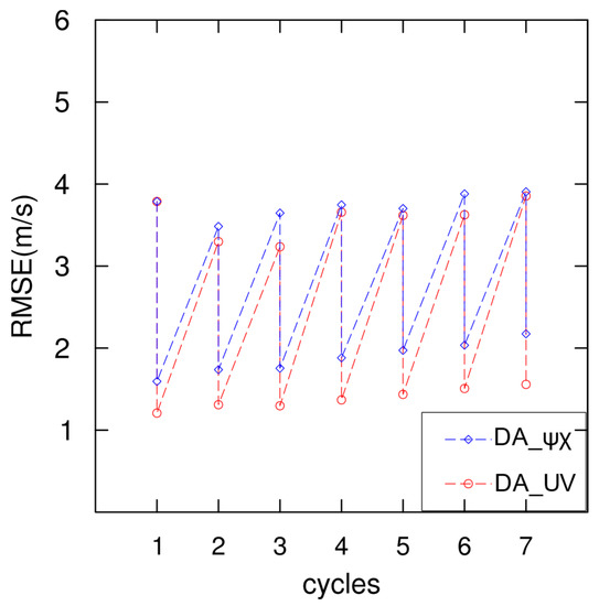 Quantitative comparisons were further conducted to evaluate the improved effect of the model wind in the two sets of assimilation experiments. Figure 10 calculates the root mean square error (RMSE) of the radar radial velocity for the background and the analysis. The RMSEs decreased the most after the first assimilation, while each subsequent assimilation made the RMSEs decrease. This was due to the simulation wind that was much less close to the real situation on the background field of the model at the first assimilation, so the increment of the first assimilation was also the largest. After the first assimilation, the RMSE of the analysis of DA_UV was smaller than that of DA_ψχ. Due to the accumulation effect, from the second time, the RMSEs of the background field of DA_UV were all lower than that of DA_ψχ. The RMSEs of the analysis of DA_UV were also smaller than that of DA_ψχ. This indicates that the wind in DA_UV was closer to the real situation, and its assimilation effect was better than that of DA_ψχ.