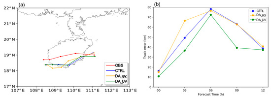 The purpose of the assimilation is to obtain a more accurate initial field. In order to evaluate the effect of the different momentum control variables, we made a 12 h deterministic forecast after the assimilation. We defined the typhoon center at the location of MSLP. Figure 11 shows the simulated track with the best track from CMA and the errors of three experiments during forecast time. At the last assimilation time, the TC center position of CTRL was northward of the best track and DA_ψχ was close to CTRL, while DA_UV obviously shifts CTRL to the south of the best track. From the Figure 11b, DA_UV was closer to the best track, with an error of about 10 km. Due to the effect of landfall, the simulated TC track error increases. The track error of DA_UV was significantly smaller than that of the other experiments. DA_ψχ had a less improved path forecast, even worse than CTRL.