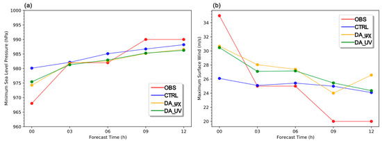 The (a) MSLP and (b) MSW of observation and three experiments during forecast time.