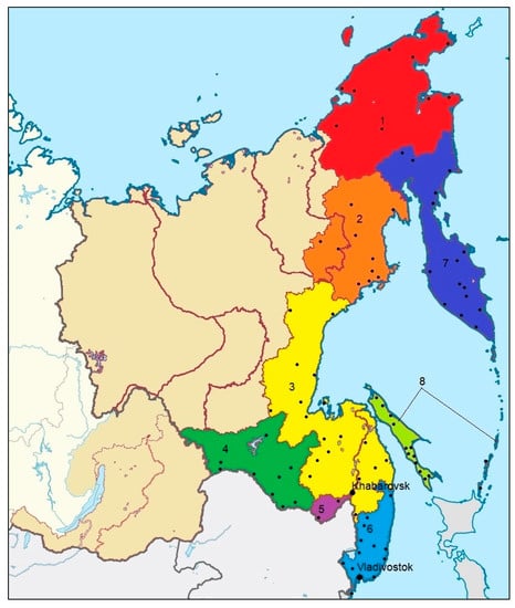The Far Eastern Federal District (FEFD) of Russia, showing all regions of the study area, as follows: 1—Chukotsky Autonomous Okrug (Chukotka); 2—Magadan Region; 3—Khabarovsky Krai; 4—Amur Region; 5—Jewish Autonomous Region; 6—Primorsky Krai; 7—Kamchatsky Krai; 8—Sakhalin Region. The capital cities of the FEFD are as follows: Khabarovsk (2002–2018) and Vladivostok (2018–present). Black dots show the location of weather stations.